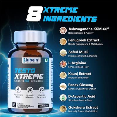 ✅ CLINICALLY STUDIED INGREDIENTS – Formulated with KSM-66 Ashwagandha, shown in studies to support healthy testosterone levels, stress reduction, and muscle strength. ✅ 8-HERB PROPRIETARY BLEND – Features Fenugreek, D-aspartic acid, Safed Musli, and Panax Ginseng to promote vitality, workout performance, and overall male wellness. ✅ SUPPORTS STRENGTH & STAMINA – It may help enhance energy, endurance, and post-workout recovery for active men. ✅ NON-GMO & QUALITY ASSURED – Made in an FDA-registered, ISO-certified facility also vegetarian-friendly capsules. ✅ DISCOVER WELLNESS WITH BLUBEIN - We combine science with nature to help men achieve peak performance, strength, and endurance naturally.
