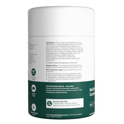 Bodywise Multivitamin Gummies fulfil nutrient deficiencies in your body resulting in better energy, metabolism and less stress improving overall health. Why do you need these Multivitamin Gummies?: Women in their mid-20s and above often have diets that lack adequate nutrition - leading to fatigue, low metabolism, and vitamin deficiencies. Bodywise Multivitamin Gummies are rich in 9 essential vitamins and 3 minerals that help fulfil these deficiencies. Boosts immunity and energy level: Women with Iron, Folic Acid, Zinc, Vitamin B5 and B12 deficiencies feel tired and are prone to the common cold. Enriched with these nutrients and more - regular intake helps boost energy levels and strengthen your immunity, which leads to better health. Balances hormone level: A dip in your mental health, i.e. frequent anxious thoughts, can be due to vitamin and mineral deficiencies. Vitamin D3 and B6 in these gummies help boost serotonin levels in the brain and regulate insulin levels which help balance hormone levels. Relieves stress: Antioxidants such as Vitamin A, C, and E protect your body from free radical damage, reducing anxiety. Vitamin D3 and B6 also play an important role in alleviating stress. Health and taste friendly:Bodywise Multivitamin Gummies have a tangy Orange flavour. This makes it better, easy and tastier than having pills. 9 Vitamins and 3 Minerals - all combined in 100% vegan & vegetarian gummy with no added sugar, no preservatives and no added colours.