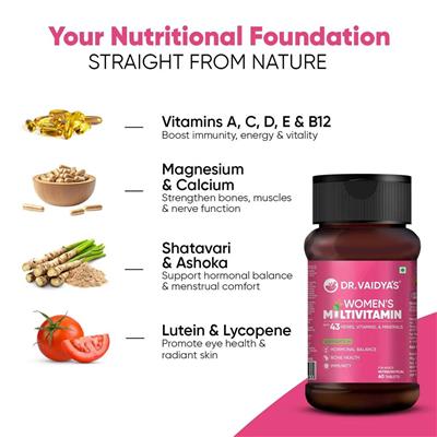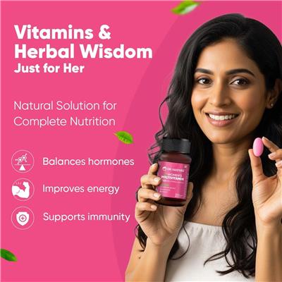 What makes this multivitamin tablet for women unique is the addition of Shatavari & Ashoka - renowned Ayurvedic herbs that help balance hormones, ease menstrual discomfort, and support emotional well-being. Unlike generic multivitamin tablets, this advanced multi vitamin women formula also contains Moringa, Lutein & Lycopene to fight fatigue, improve stamina, protect eye health, and enhance skin radiance and hair strength. With consistent use, you’ll notice better energy, glowing skin, improved mood, and reduced PMS symptoms - all while filling essential nutritional gaps in your diet. No prescription needed 60 multivitamin tablets for women per pack Made with quality-tested herbs & essential nutrients No known side effects Store in a cool, dry place away from direct sunlight