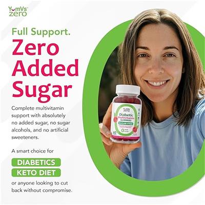 MULTIVITAMIN SUPPLEMENT Daily dietary supplement for adults, YumVs sugar free gummy vitamins contain 14 essential vitamins and minerals that are vital for health and wellness. Our Multivitamin contains Vitamins C, A, D3, E, B6, plus Chromium, Thiamine, Folate and Magnesium, and none of the bad stuff: 0 sugars or sugar alcohols, 0 artificial flavors, 0 gluten, 0 GMOs! SUGAR FREE & KETO FRIENDLY Mouthwatering and delicious natural raspberry-flavored chewable gummies are sugar free, with only 1g net carbs, making them Keto Friendly. Enjoy tasty sugar free gummy vitamins, even while watching your sugar intake. Ideal for people with diabetes and pre-diabetes. Serving size: 2 Gummies. 60 count per bottle. PREMIUM INGREDIENTS We believe in using high-quality, natural ingredients and maintain a peanut and tree nut-free production facility. Packed with nutritional value, get your daily dose of essential vitamins and minerals in a yummy way! Our formula is sugar free, non GMO, gluten free, gelatin free and contains only naturally sourced flavors and colors. Certified Kosher/Halal and vegetarian. RECOMMENDED USE We know staying healthy is hard, that's why at YumVs we've created a process that packs all the nutrients you need into our tasty all-natural vitamins. YumVs Zero gummy vitamins are an easy way to incorporate essential vitamins into your daily routine!