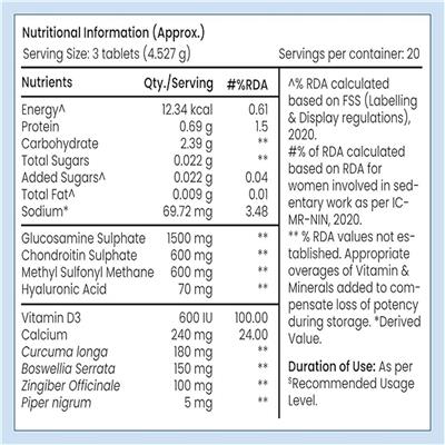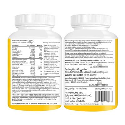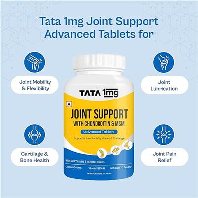 Supports cartilage and bone health Supports joint mobility and lubrication May help relieve joint pain Helps in the management of osteoarthritis and rheumatoid arthritis Enriched with Glucosamine, MSM, Vitamin-D3, Calcium, and Chondroitin Contains natural ingredients such as Boswellia Serrata, Turmeric Rhizome Extract, and Ginger Rhizome Extract Information about Joint Support Advanced Tablet with Glucosamine, MSM, & Chondroitin | by Tata 1mg Tata 1mg Joint Support Advanced Tablets Tata 1mg Joint Support Advanced Tablets are packed with Glucosamine Sulphate and Chondroitin that help maintain joint and cartilage health. MSM (Methyl Sulfonyl Methane) helps relieve pain. Hyaluronic Acid is important for joint lubrication. The goodness of natural ingredients such as Boswellia Serrata, Turmeric Rhizome Extract, and Ginger Rhizome Extract helps with anti-inflammation and maintaining overall joint health. Key Ingredients: Glucosamine Sulphate, Chondroitin Sulphate, MSM, Hyaluronic Acid, Vitamin-D3, Calcium, Turmeric Rhizome Extract, Boswellia Serrata, Ginger Rhizome Extract Key Benefits: Helps maintain overall joint, bone, and cartilage health Supports joint mobility and lubrication May help relieve joint pain Helps manage bone related issues
