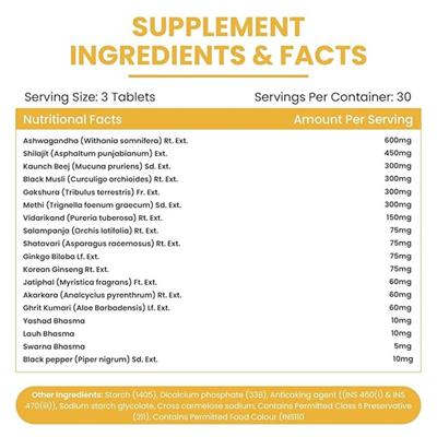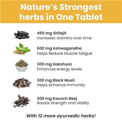 HELPS TO BOOST PERFORMANCE NATURALLY: Vlado’s Himalayan Organics Testosterone Booster contains a blend of 17+ natural herbs including Ashwagandha, Shilajit, Kaunch Beej, Black Musli, Gokshura, Methi and Vidarikand that help enhance daily energy levels, stamina, and overall performance by balancing essential hormones in men. UNLEASH YOUR FULL POTENTIAL: This supplement helps awaken your body's full potential, enhancing stamina, strength, and vitality in men. It helps you feel more energized and confident in your daily activities. HIGH POTENCY SUPPLEMENT: Our 100% Ayurvedic supplement delivers 2800 mg+ of highly potent Ayurvedic herbs that helps in muscle strength, growth, and recovery, making it an ideal supplement for fitness enthusiasts and gym enthusiasts. NATURAL TESTOSTERONE SUPPORT: Powered by 17+ potent Ayurvedic herbs like Ashwagandha, Safed Musli, Gokshura, and Shilajit for balanced male hormone levels. HELPS TO BOOST MUSCLE STRENGTH, ENERGY, AND VITALITY: Reach your peak performance with our testosterone booster packed with 600mg Ashwagandha, 450 mg Shilajit, 300 mg Kaunch Beej, 300 mg Black Musli and 300 mg Gokshura.