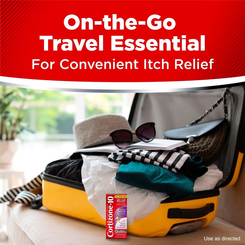 INCLUDES: One (1) 2 oz. tube of Cortizone-10 Maximum Strength* Intensive Healing Itch Relief Cream (*Among topical anti-itch OTCs) RELIEVES ITCH: Cortizone-10 helps relieve itch associated with minor skin irritations, inflammation, and rashes due to eczema, psoriasis, insect bites, seborrheic dermatitis, poison ivy, oak, sumac, and more MOISTURIZES & RESTORES: Includes 10 moisturizers, plus vitamins A, C, and E to nourish skin and help restore skin's moisture barrier ACTIVE INGREDIENT: Formulated with 1% hydrocortisone for maximum-strength itch relief without a prescription TRAVEL ESSENTIALS: The perfect addition to first aid kits, camping essentials and travel bags for anytime you need on-the-go relief FAST ACTING: Relieves itch in five minutes with 24-hour moisture that's gentle on skin, fragrance free, and dye free