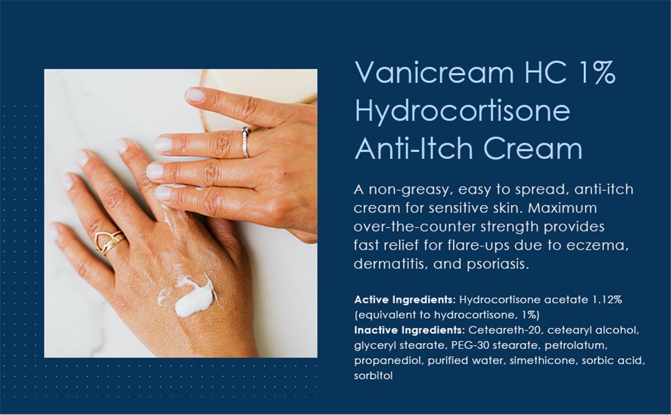 Vanicream HC 1% Hydrocortisone Anti-Itch Cream provides effective relief from itching associated with minor skin irritations, inflammation and rashes due to eczema, seborrheic dermatitis, psoriasis, jewelry, detergents, insect bites, soaps, cosmetics, poison ivy, oak and sumac. Specially formulated for sensitive skin Vanicream HC 1% Hydrocortisone Anti-Itch Cream is free of dyes, fragrance, masking fragrance, lanolin, parabens, and formaldehyde