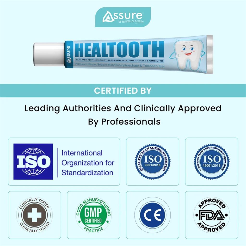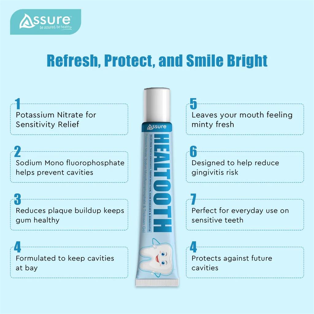 Assure Tooth Pain Relief Gel is specially formulated to ease toothaches, gum discomfort, and sensitivity. This fast-acting tooth pain gel provides targeted comfort, offering instant tooth pain relief from sharp sensations caused by hot, cold, or sweet foods. Packaged in an easy-to-use tube, this instant tooth pain relief gel ensures precise application directly on the problem area, giving you targeted comfort whenever you need it. Trusted for its fast action and long-lasting effect, Assure Tooth Pain and Sensitivity Gel is your reliable partner for healthier gums, stronger teeth, and a confident smile.