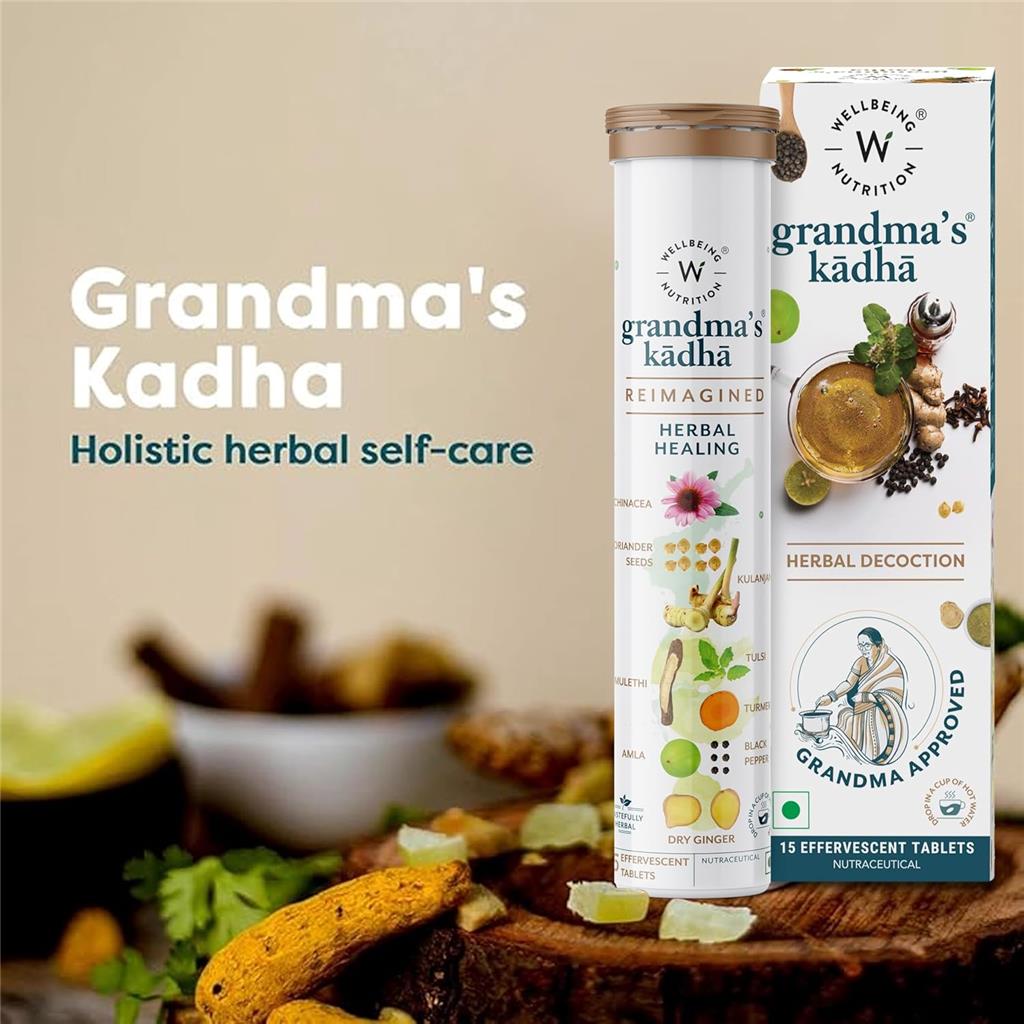 About this item HERBAL HEALING BLEND Wellbeing Nutrition’s Grandma’s Kadha is an Ayurveda-inspired effervescent drink crafted with a powerful blend of 13 adaptogenic herbs. Rooted in traditional wisdom, this modern formulation helps strengthen immunity, combat early signs of illness, and support the body’s natural defense mechanisms—offering you the comfort and protection of age-old remedies in a convenient, daily wellness ritual. TIME TESTED AYURVEDIC REMEDY Grandma’s Kadha is a potent Ayurvedic remedy designed to provide relief from cold, cough, and infections. Rooted in over 5000 years of Ayurveda, this potent formula harnesses the power of 13 adaptogenic herbs to strengthen immunity and support overall wellness. Conveniently available in a wholesome, water-soluble effervescent tablet, it offers a modern and effective way to experience the healing benefits of traditional herbal medicine. FORTIFIED WITH 13 PROVEN ADAPTOGENS Rooted in the science of Ayurveda, Grandma’s Kadha is enriched with 13 powerful adaptogenic herbs, each carefully selected for its unique healing properties. Echinacea supports immunity and helps combat chronic fatigue, while Tulsi leaves relieve headaches and earaches. Coriander seeds and dry ginger aid in regulating blood sugar levels, while Kulinjan and Mulethi strengthen the digestive and respiratory systems. The potent anti-inflammatory compounds in turmeric reduce inflammation, and black pepper enhances nutrient absorption with its rich antioxidant properties. CLEAN AND EFFECTIVE FORMULA Our Target Release effervescent supplements are dairy-free, gluten-free, soy-free, plant based and clinically proven and certified for optimal safety, purity and efficacy.