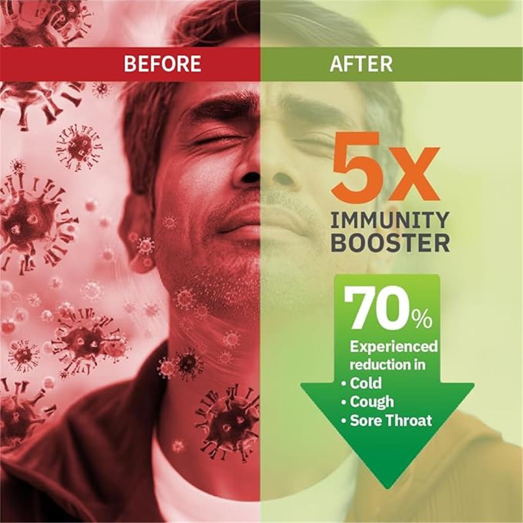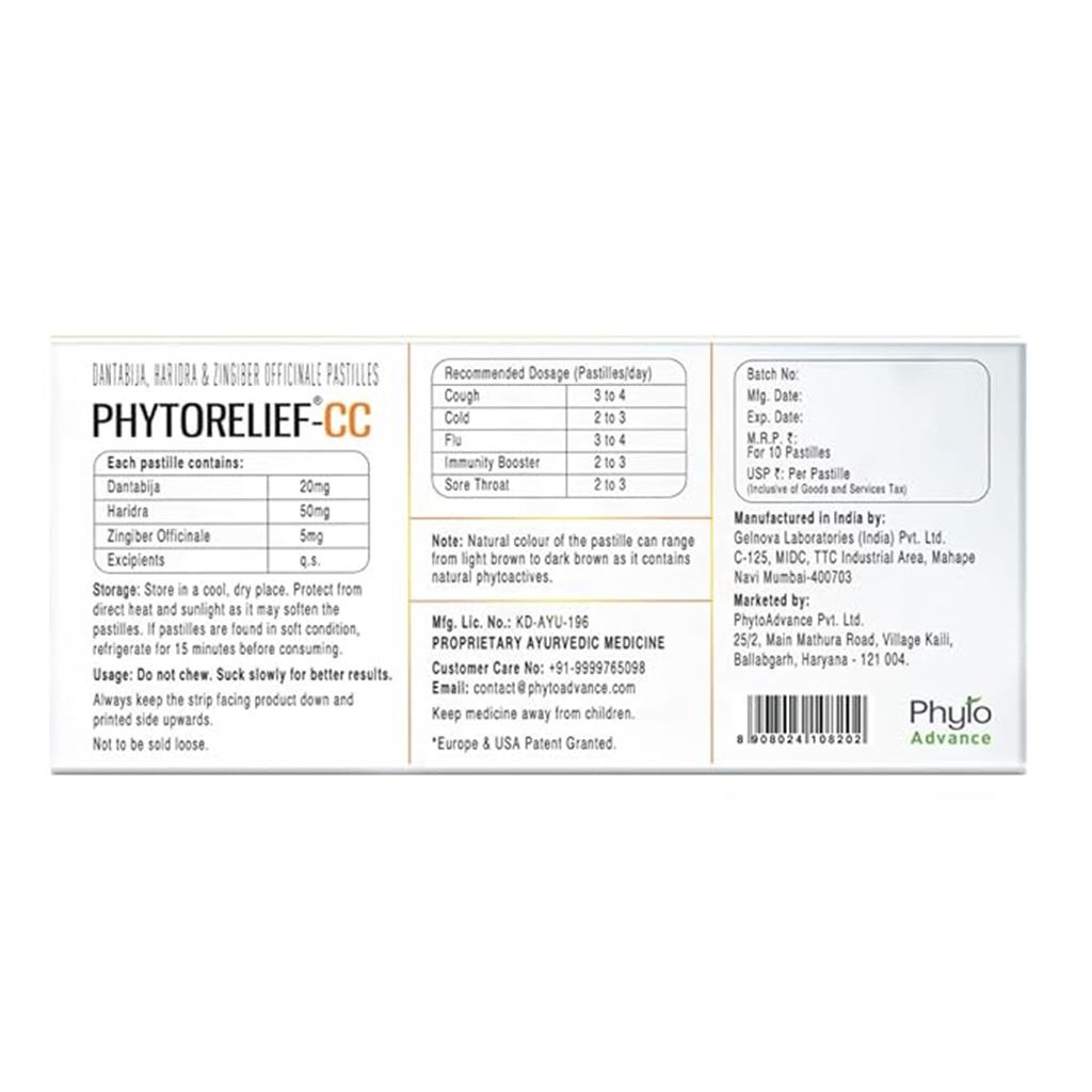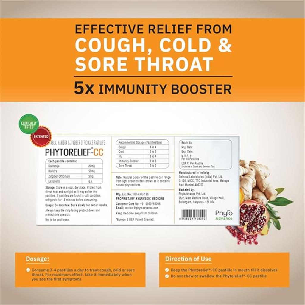 About this item BENEFITS: NATURAL DEFENSE AGAINST COLD, COUGH & SORE THROAT & STRENGTHEN IMMUNITY - Phytorelief-CC is designed to NATURALLY BOOST YOUR IMMUNITY BY UP TO 5 TIMES, helping your body fight off infectious coughs, colds, and sore throats. By CREATING A PROTECTIVE BARRIER in your respiratory tract and activating the power of your saliva by increasing the lysozymes to kill germs, Phytorelief-CC can provide your body with the support it needs to stay healthy without any side effects. UNMATCHED PATENTED & SCIENTIFIC FORMULA THAT IS CLINICALLY TESTED: 70% EXPERIENCED REDUCED OCCURRENCE OF SIGNS/SYMPTOMS OF COUGH, COLD & SORE THROAT EPISODES, with a 5X BOOST in IMMUNITY. ‘PHYTO-ACTIVE’ – HIGH POTENCY PLANT EXTRACTS- THE SECRET TO SUPERIOR EFFICACY: Uncover the secret to remarkable effectiveness with Phytorelief-CC pastilles, our PHYTOCEUTICAL solution packed with HIGHLY POTENT "Phyto-actives" derived from Ginger, Turmeric & Pomegranate, expertly extracted and synergized using our exclusive Phyto-advance technology for superior efficacy. DISCOVER THE AWARD-WINNING PHYTORELIEF-CC: NATURAL RELIEF FOR COUGHS, COLDS, AND SORE THROATS: Join the many satisfied customers who trust the award-winning Phytorelief-CC for relief from coughs, colds, and sore throats. Our formula recently won the prestigious BARC Rising Brand of Asia 2021-2022 in the Pharmaceutical-OTC category. DIRECTION OF USE & DOSAGE: Let the Phytorelief-CC pastille dissolve slowly in the mouth and do not chew or swallow it. The pastille will slowly dissolve in the mouth to kill germs that cause cough, cold and sore throat. Consume 3-4 pastilles a day for best results.