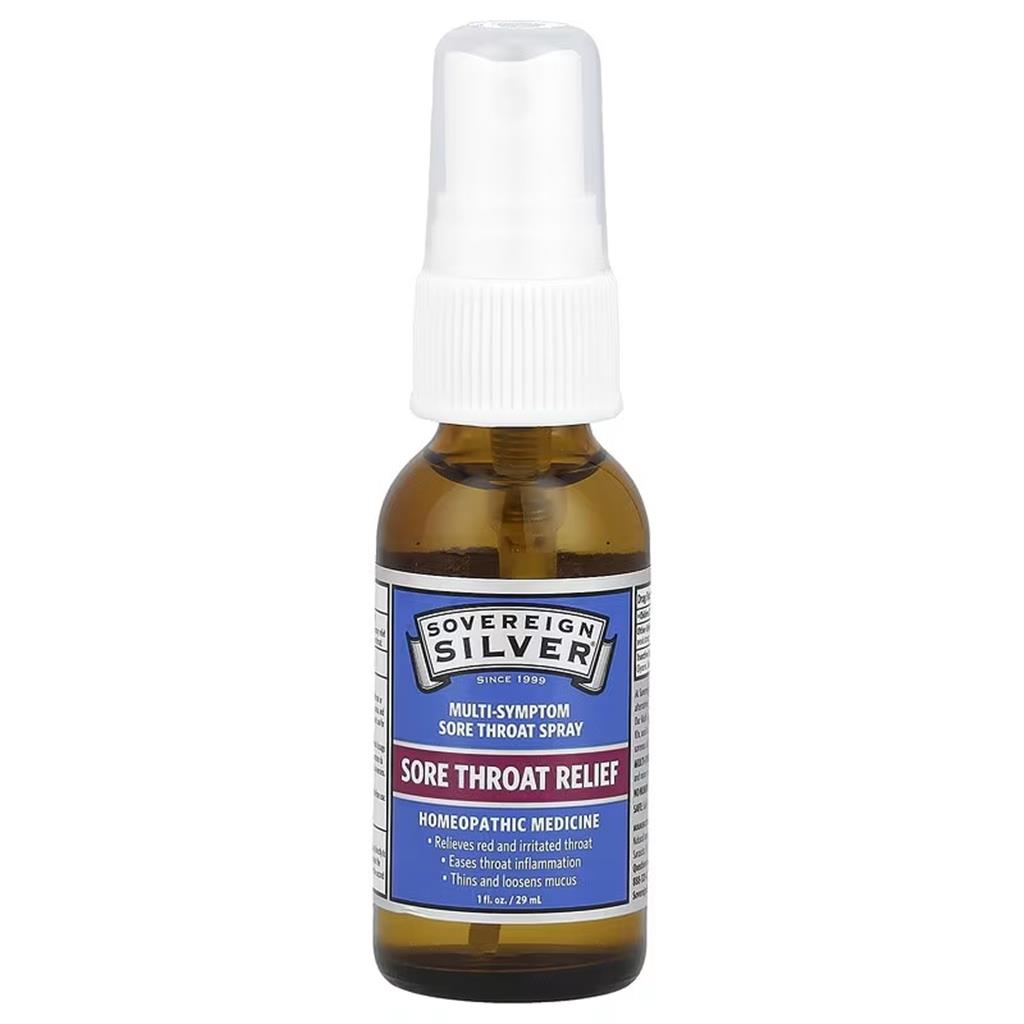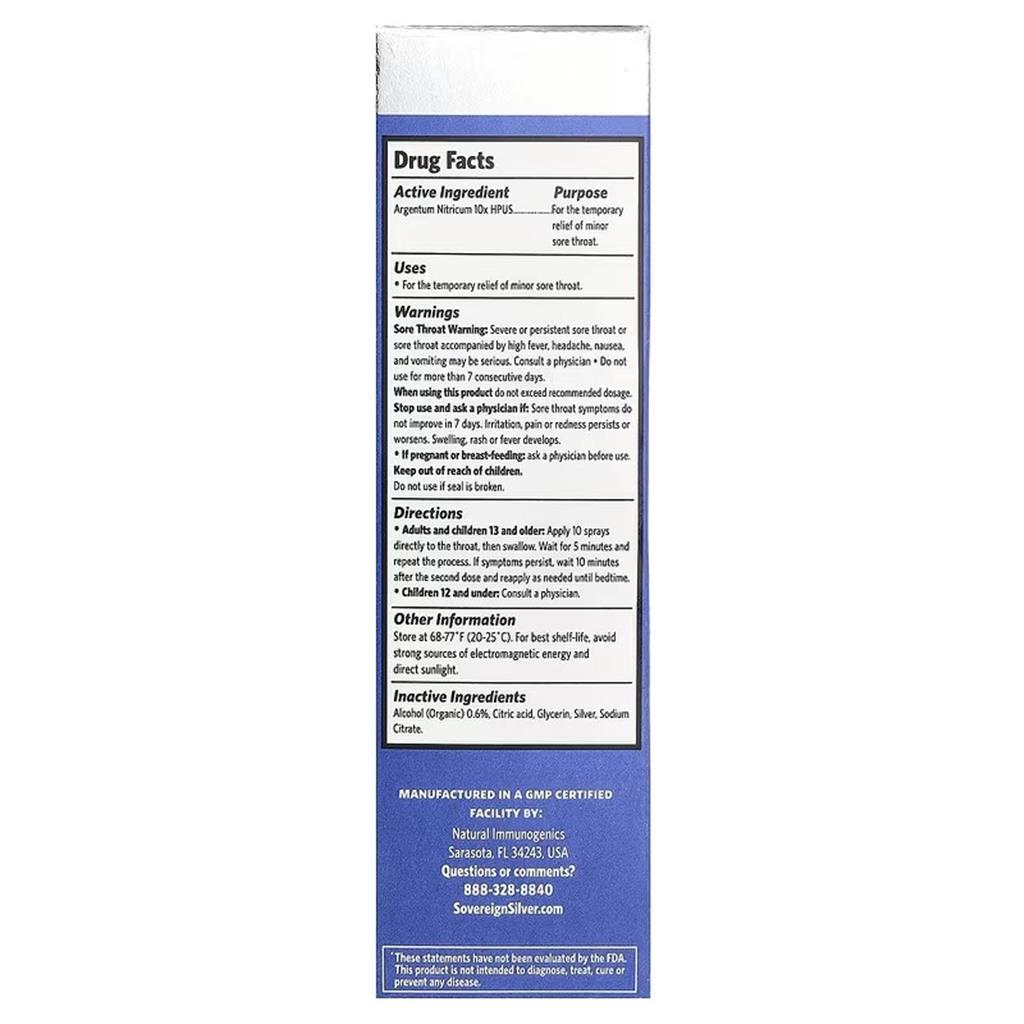 Uses: For the temporary relief of minor sore throat. At Sovereign Silver we bring science and nature together to provide alternatives to standard remedies. Our Multi-Symptom Sore Throat Spray contains Argentum Nitricum 10x, used in homeopathy for a myriad of issues associated with soreness of the throat. Why Sovereign Silver Sore Throat Relief? Multi-Symptom Sore Throat Relief: Relieves sore throat and minor inflammation due to coughs, colds and voice overuse. No Numbing: Relieves pain without numbing. Use For: Red, dry, sore throat, and hoarseness. Safe: Safe for the whole family to use.